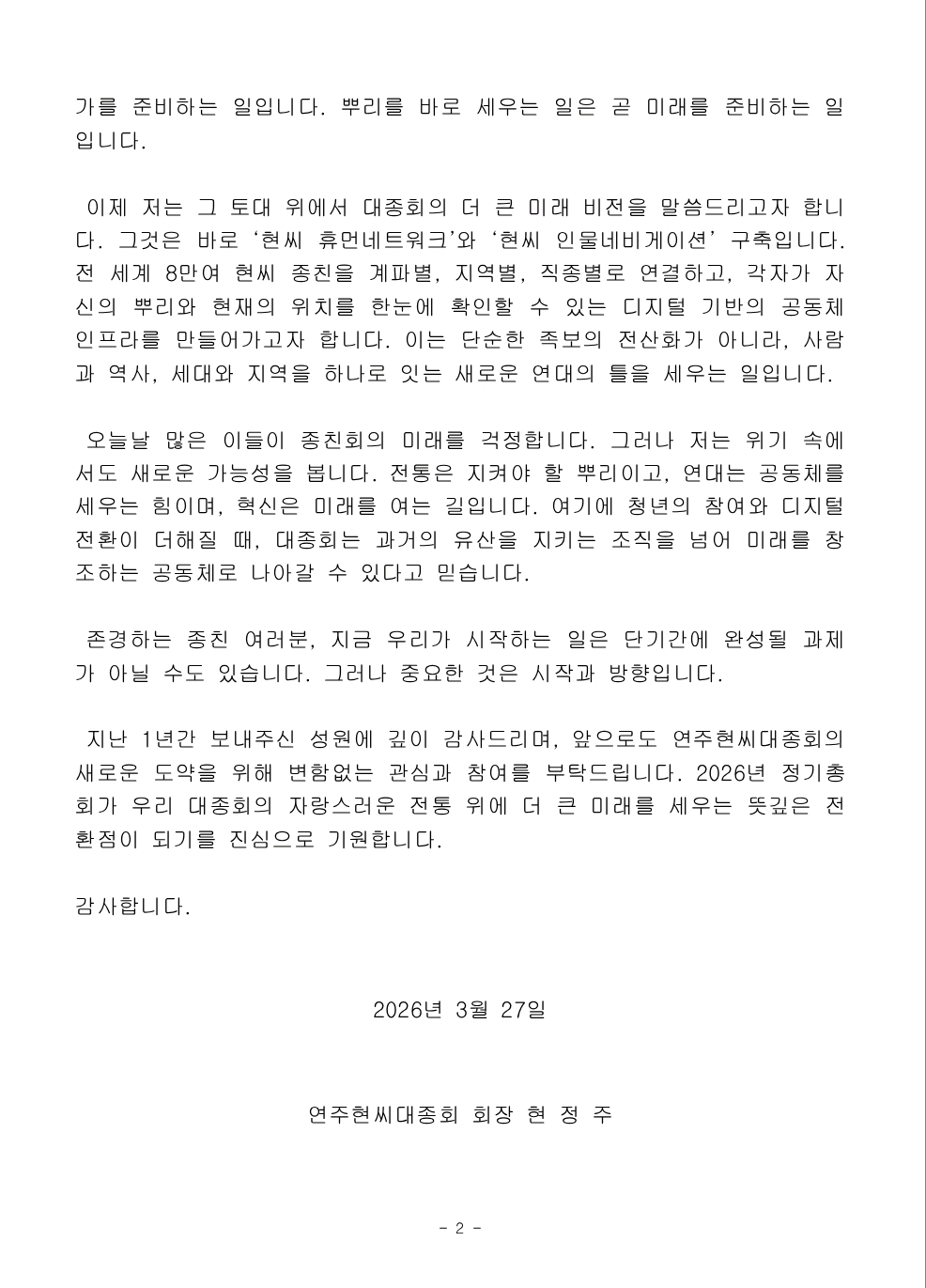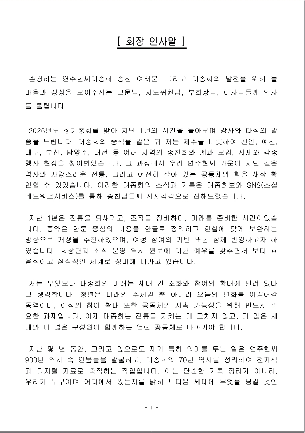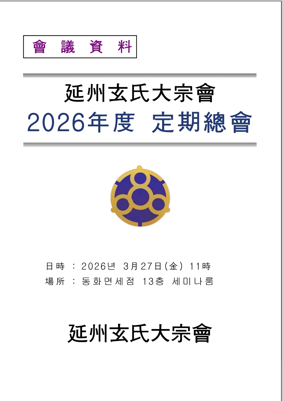 1. 연주현씨대종회 2026년 정기총회 개최를 공고하오니 명예회장, 부회장, 고문, 감사, 지도위원 외 연주현씨 모든 분께서는 바쁘시겠지만 많은 관심과 참석을 부탁드립니다.