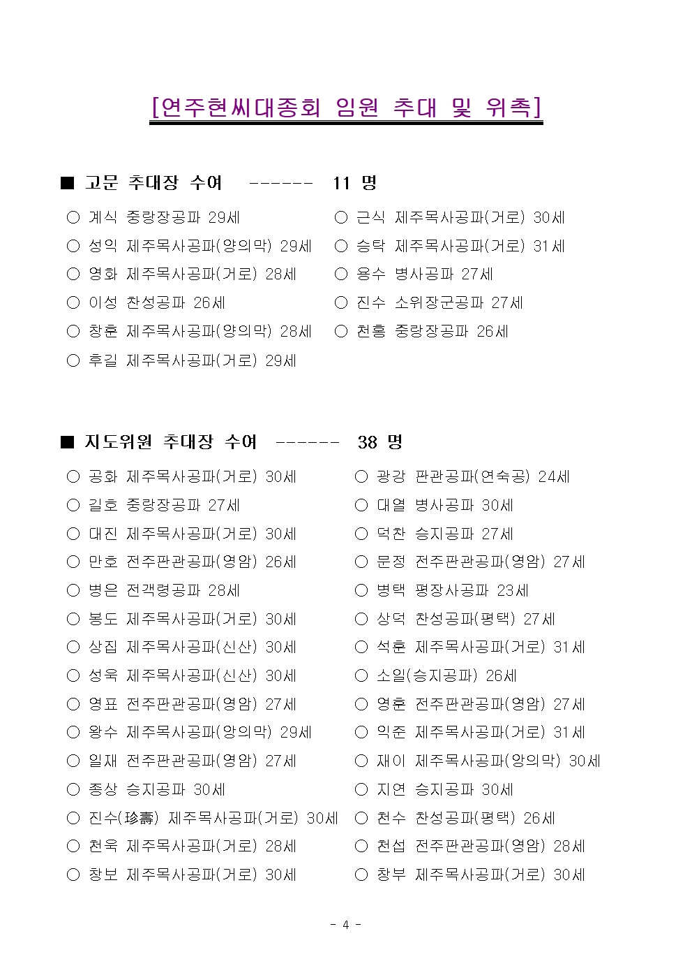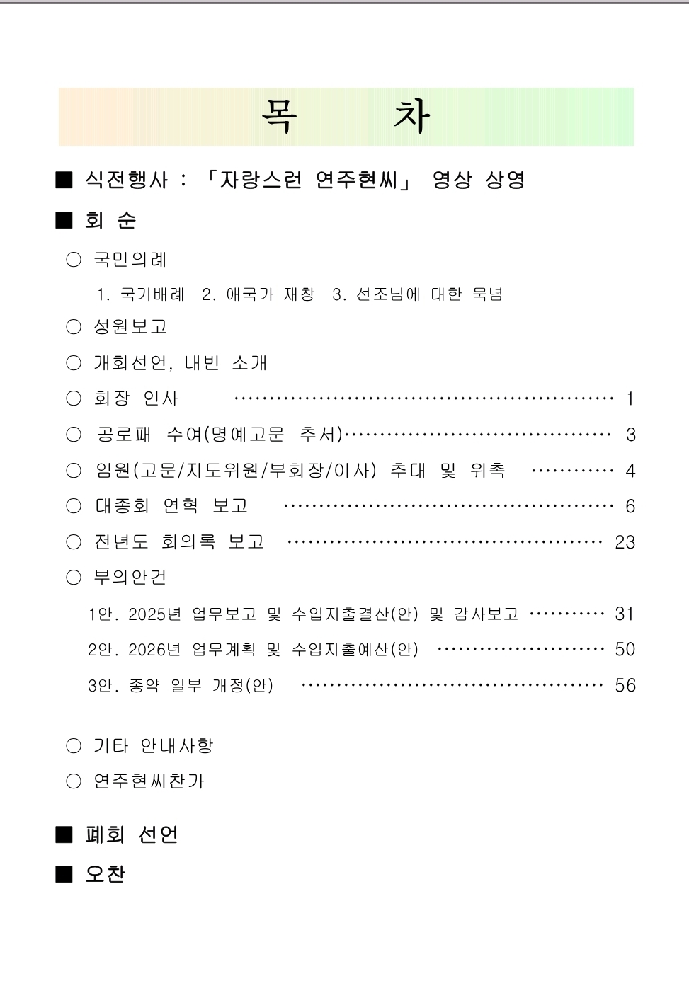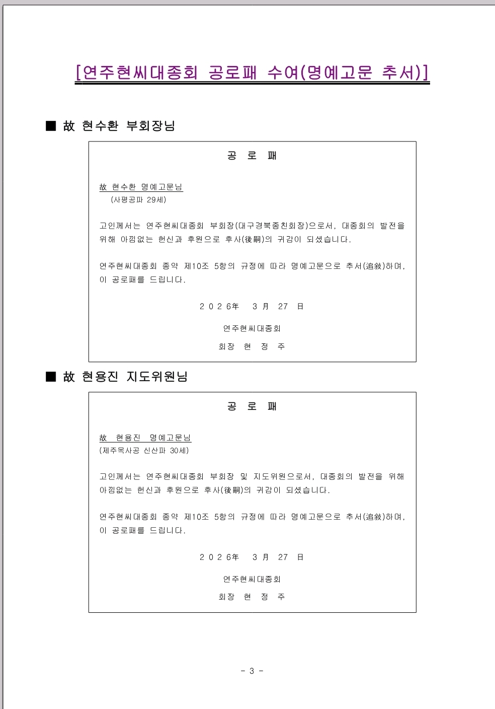 1. 연주현씨대종회 2026년 정기총회 개최를 공고하오니 명예회장, 부회장, 고문, 감사, 지도위원 외 연주현씨 모든 분께서는 바쁘시겠지만 많은 관심과 참석을 부탁드립니다.