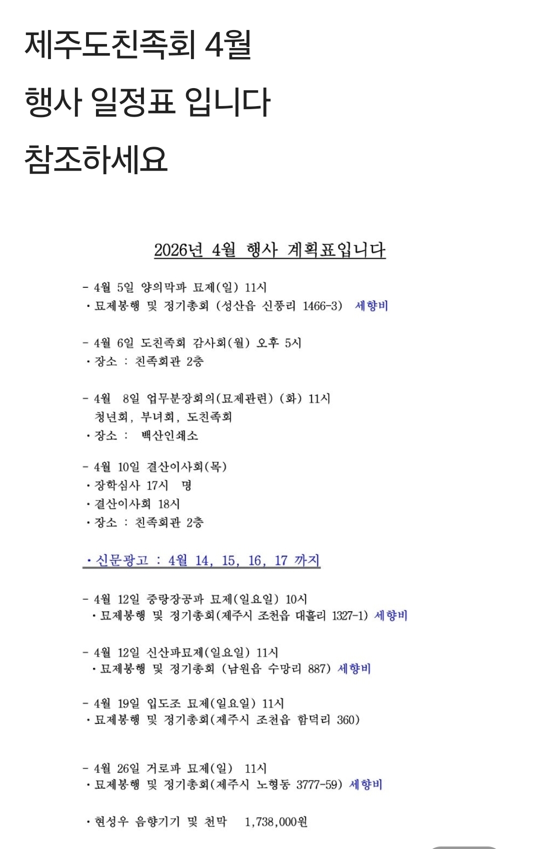 각 문중의 시제 및 행사 일정이 잡히시면 대종회로 연락 부탁드립니다.
