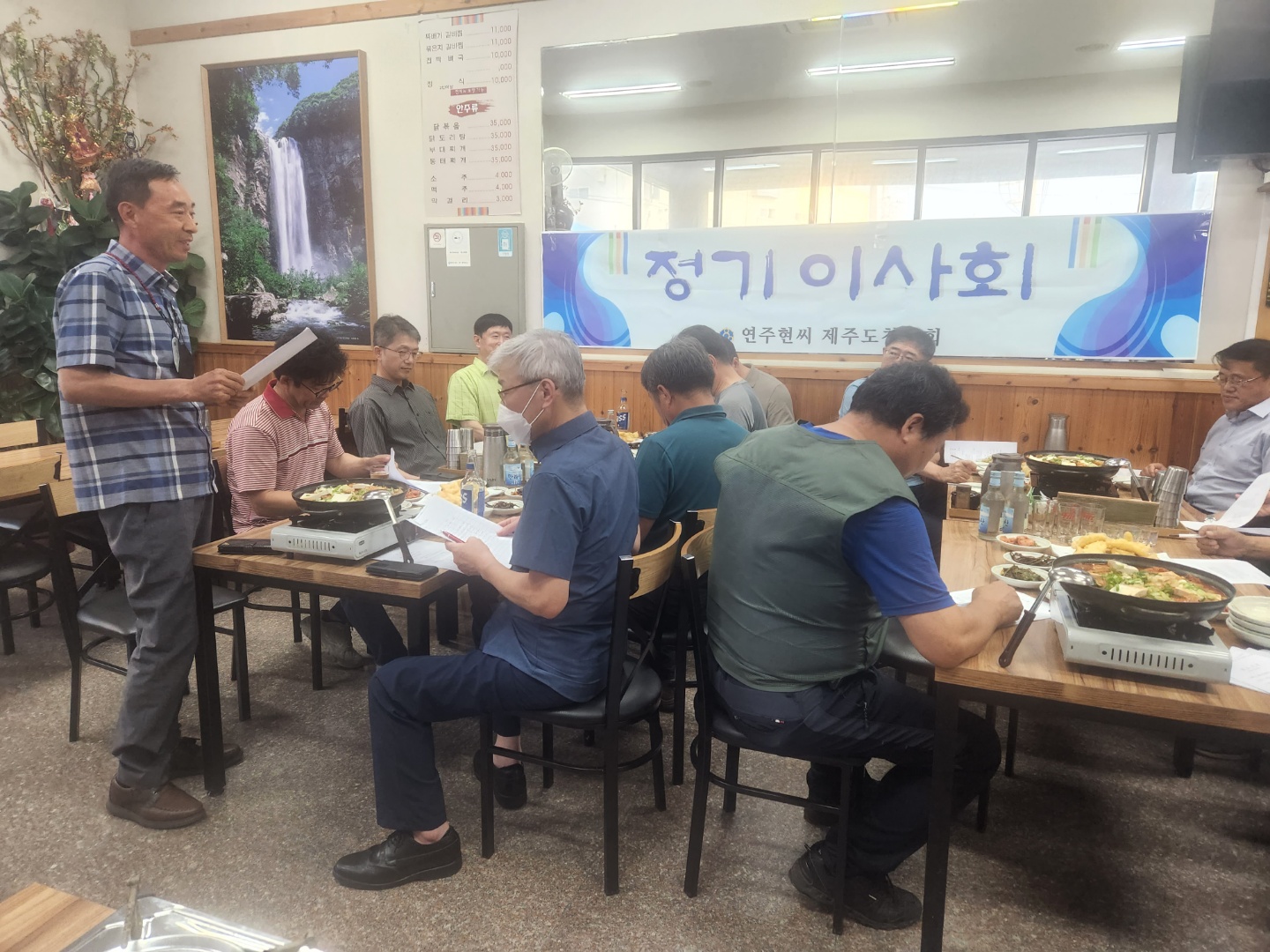 다 음 1.개최일시:7월14일 19시-22시 2.개최장소:제주시 도두동 제라한뚝배기식당 3.참석인원:17명 4. 회의내용 가.임원구성 및 재무상황 보고 나.협의사항 -.친족야유회 추진은 회장에게 위임 -.연주현씨 역사 및 문화탐방 추진 (9월16일 대종회 방문 예정) 다.기타사항 -.제주시지역청년회 야유회가 7월17일 일요일 시행함에 따라 참여 협조 -.4월 묘제에서 받은 수고비는 제주도의원 3명에게 전달한 당선축하 난화분 대금으로 사용하였음을 보고